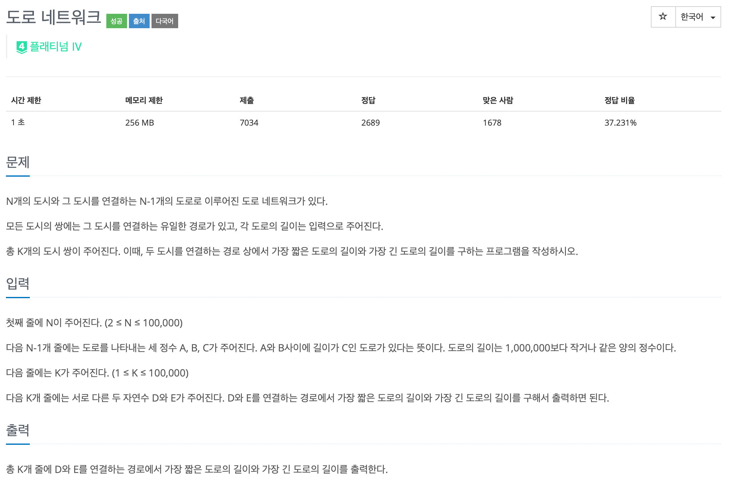 LCA 2 에서는 parents[] 배열에 2^K 번째 부모 노드들을 저장했었는데, 이것을 응용해 2^K 번째 부모 노드까지의 경로에서 에지의 최소값을 저장하는 배열과 최대값을 저장하는 배열을 만들기만 하면 문제를 해결할 수 있다.