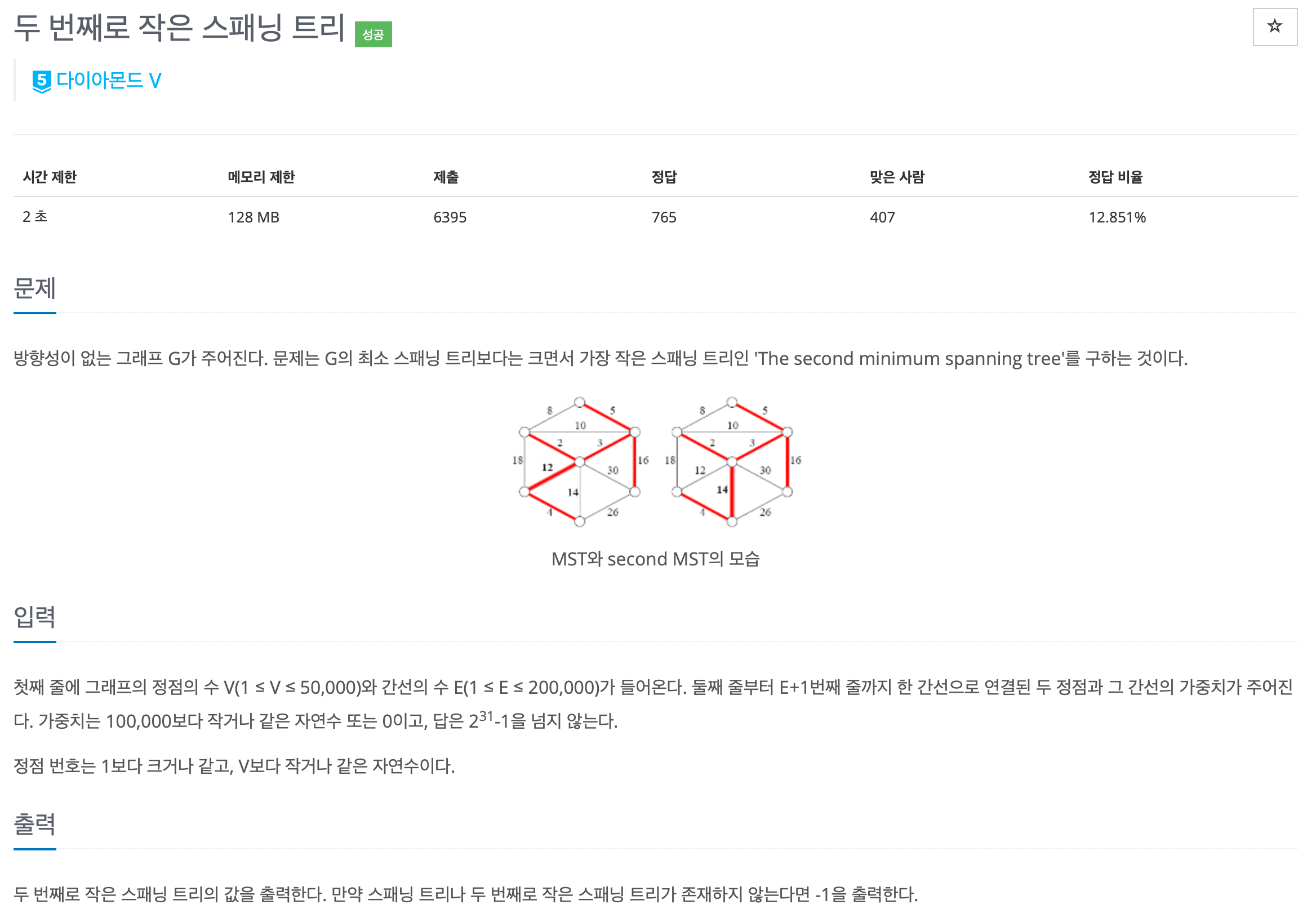 두 번째로 작은 스패닝 트리를 구할 때, MST에 포함되어있지 않은 에지를 골라서 그 에지가 잇는 두 노드의 경로 중 최대값 에지를 빼는 과정이 필요하다.