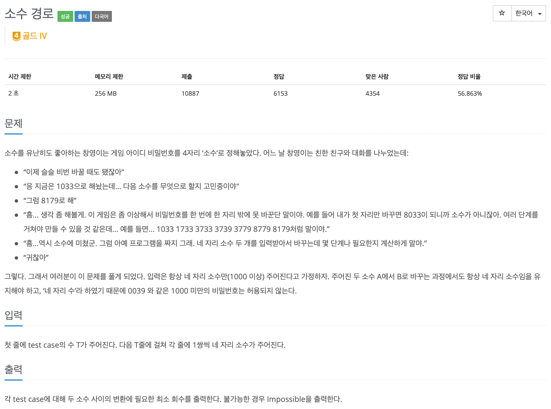 BFS 문제중에 좀 특이하게 맵 탐색이 아닌 다른 공간을 탐색하는 문제이다. 어떤 4자리 소수에서 각 자리수를 바꿔가며 다른 소수로 이동하면서 탐색을 하게 된다.