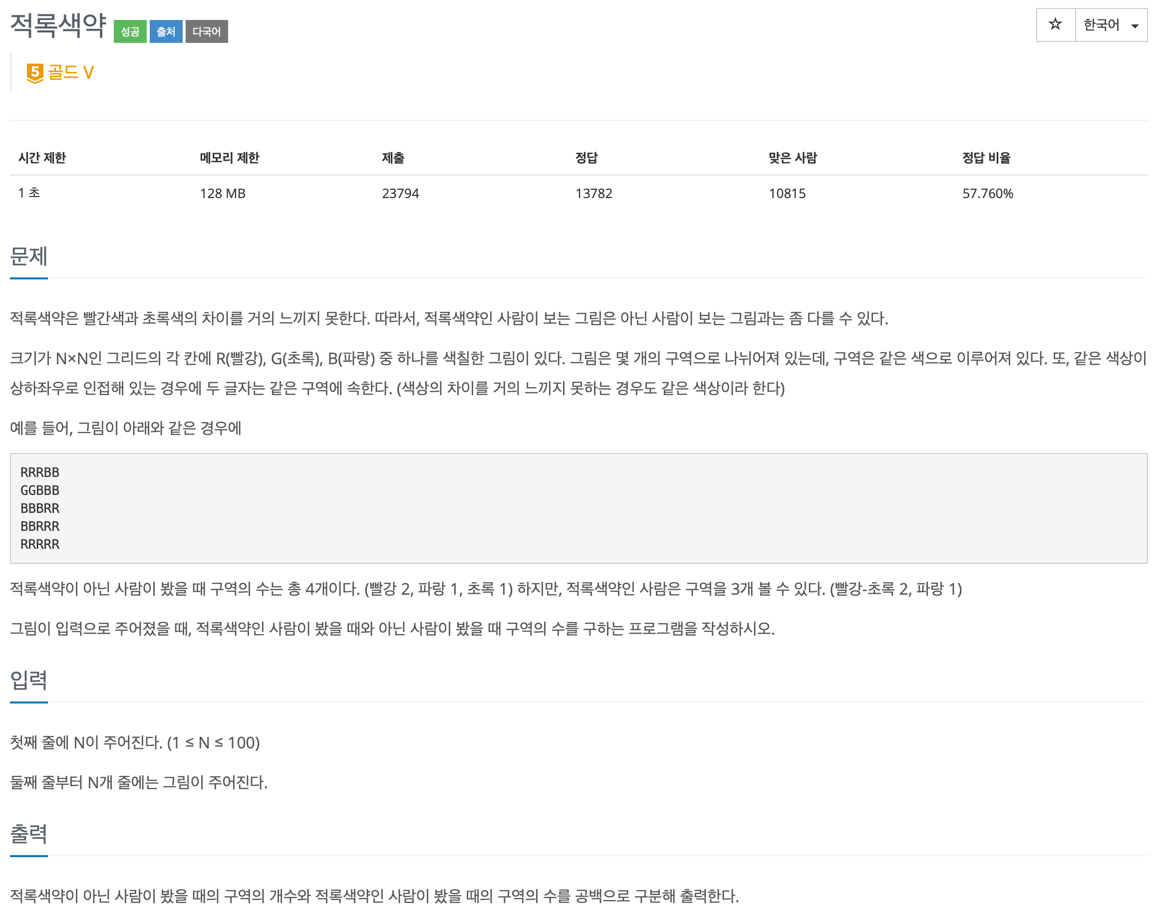 이제 정상시야와 적록색약을 구분하면 되는데, 그냥 똑같은 로직에 똑같은 배열을 하나 더 만드는 것으로 해결했다. N*N 맵으로 탐색을 하게 되는데, N이 100으로 크지 않기때문에 똑같은 맵을 하나 더 만들어도 메모리가 초과되지 않을 것이다. 정상시야의 경우, 탐색할 때 계속 같은 색일 경우 탐색이 진행되었다. 적록색약일 경우, 해당 조건을 살짝 바꿔 R일때 R, G인 경우, G 일때 R, G인 경우, B 일때 B일 경우 탐색을 계속하도록 if 문만 바꿨다. 템플릿으로 만들어서 깔끔하게 할 수도 있을 것 같다.