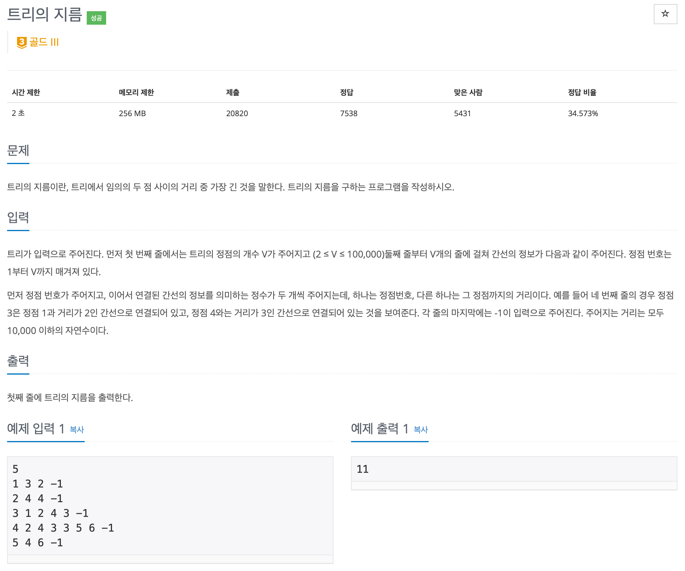 트리를 받아. 트리에서 나올 수 있는 가장 긴 거리(트리의 지름)를 구하는 문제이다.