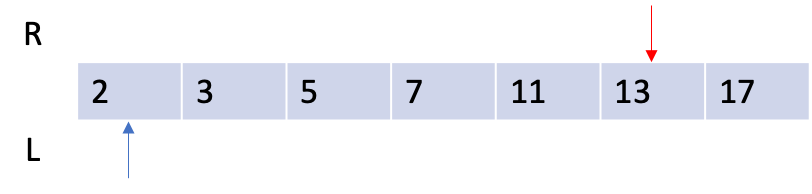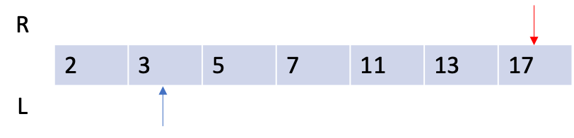소수가 들어있는 배열이 있고, 그 배열의 원소를 가르키는 Right(R) 인덱스와, Left(L) 인덱스를 만든다. 두 인덱스는 첫번째 원소를 가르킨다. 여기에, 현재 합을 저장하는 sum 변수를 만들어 주면 연산할 준비가 되었다.