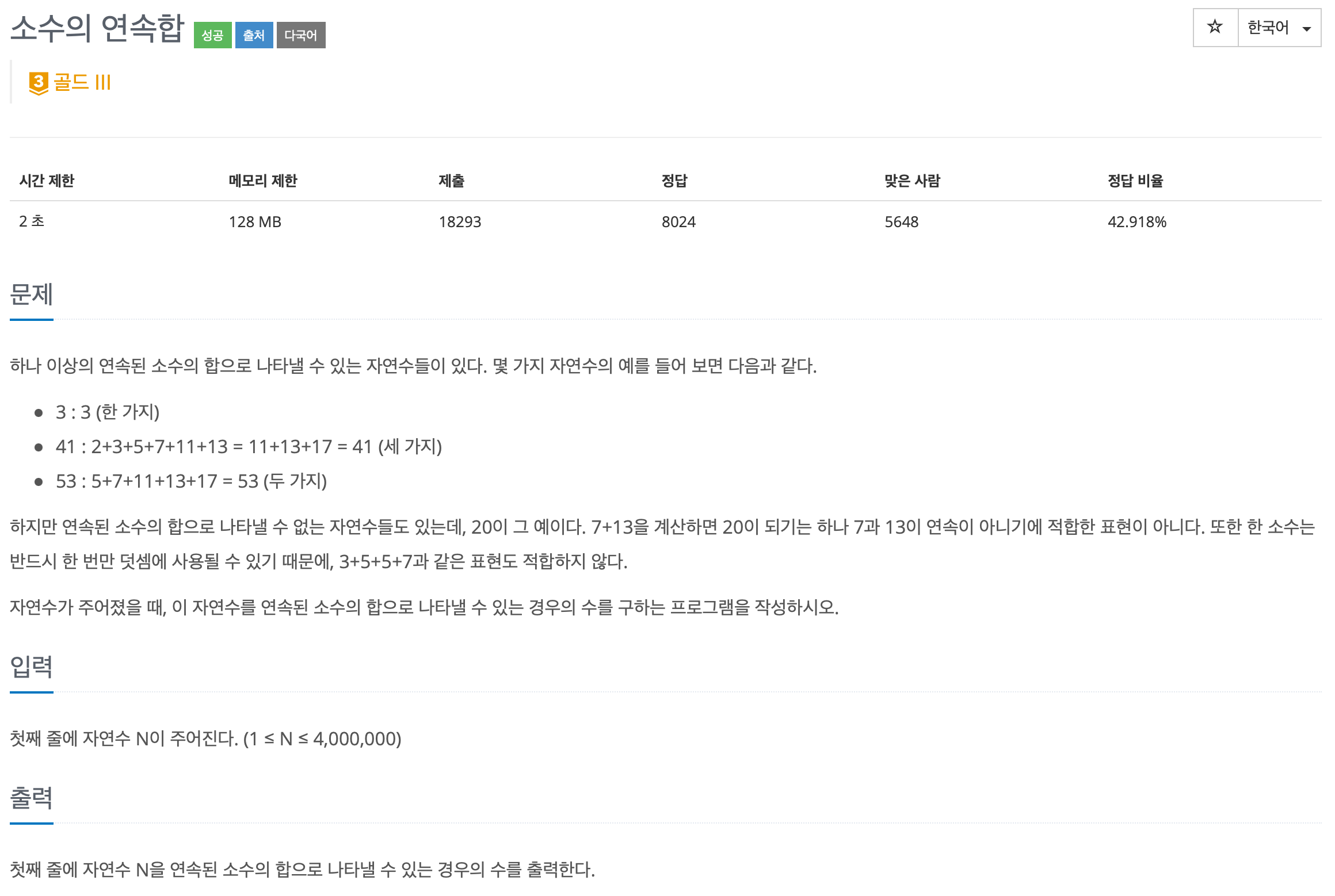 소수들의 연속합을 구하는 문제이다. 어떤 수를 입력으로 받아, 그 수를 소수의 연속합으로 어떻게 표현할 수 있는지 개수를 출력해주면 된다. 문제 제목이 너무 문제 내용이다...
