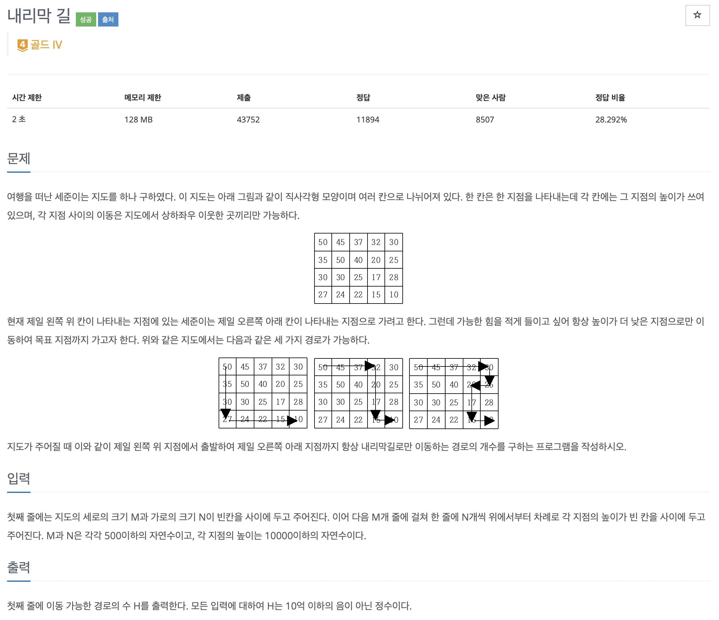 오늘도 DP 문제이다. 2차원 지도를 입력으로 받아 0, 0 위치에서 N - 1, M - 1 위치까지 경로가 몇개 있는지 찾는 문제이다.