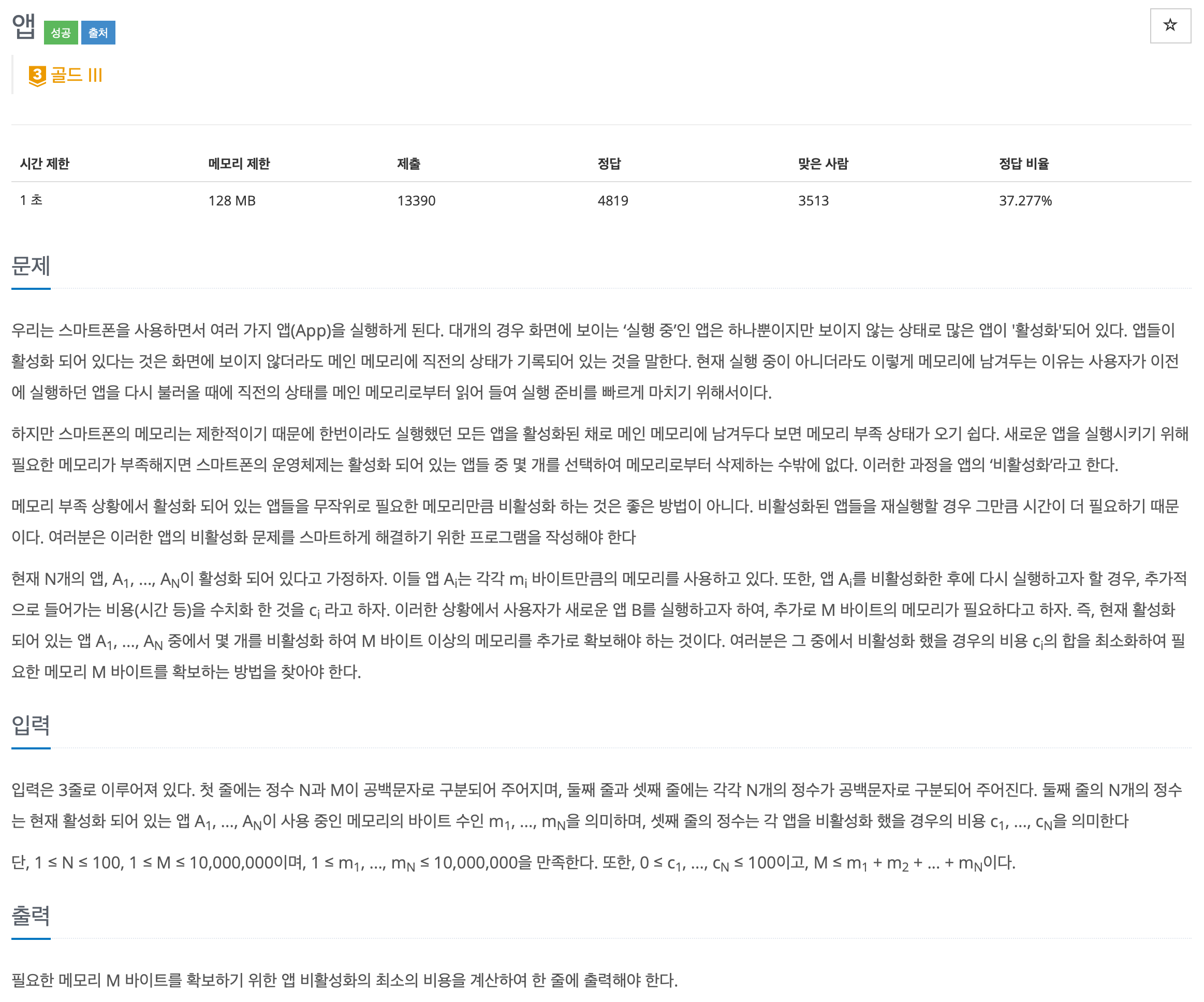 따라서 dp[i][j] = i번째 앱까지 봤을때, j비용으로 얻을 수 있는 메모리의 크기가 된다.