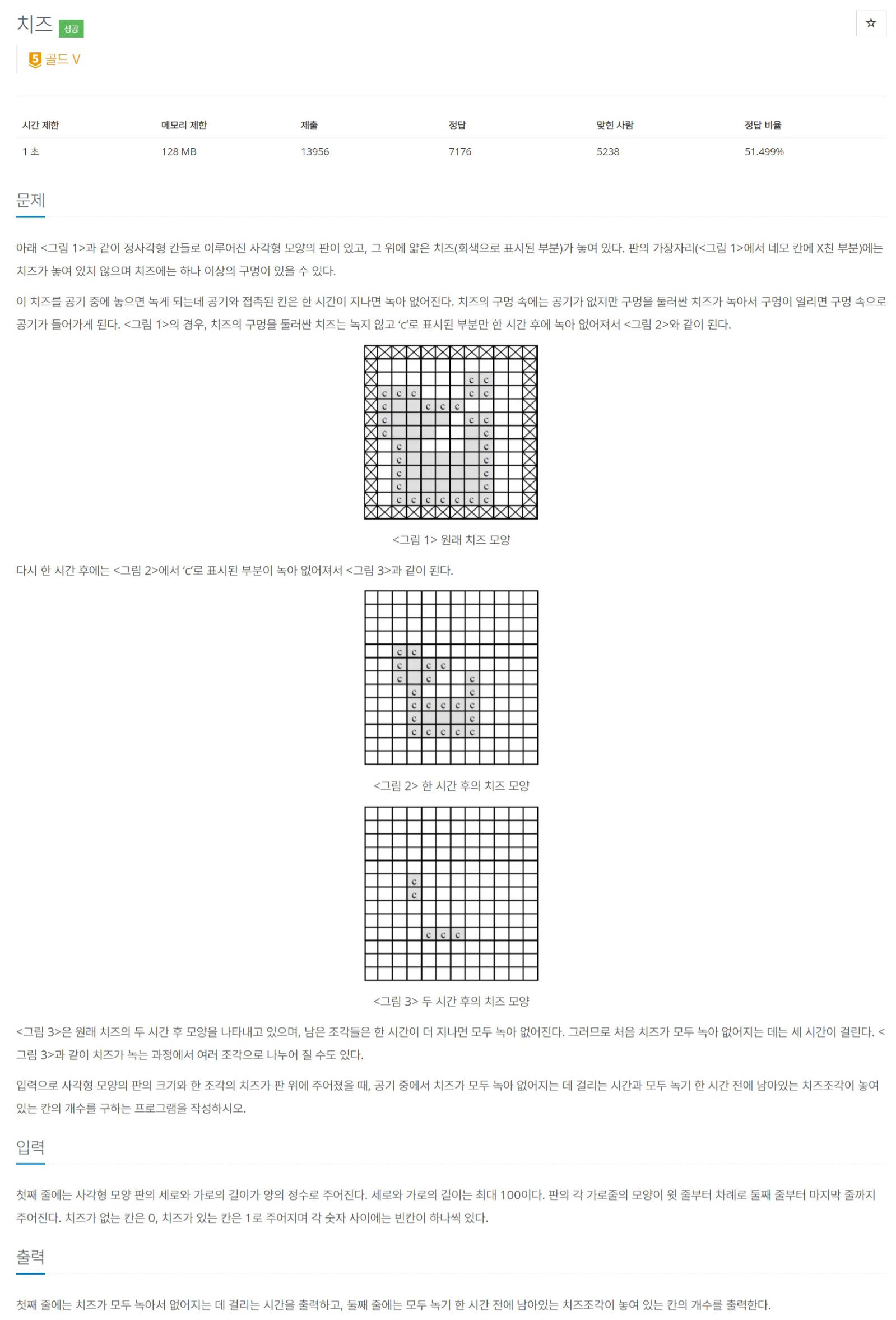 한번 모든 테두리에서 BFS 탐색으로 접촉면을 표시해준 다음, 전체 위치를 돌면서 녹는 부분을 제거해주고, 치즈 자리수를 세줬다. 치즈 자리수가 0이 되면 모든 치즈가 없어진 것이므로 탐색 종료! 가장 마지막으로 계산했던 치즈 자리수와 반복 횟수를 출력해주면 된다!