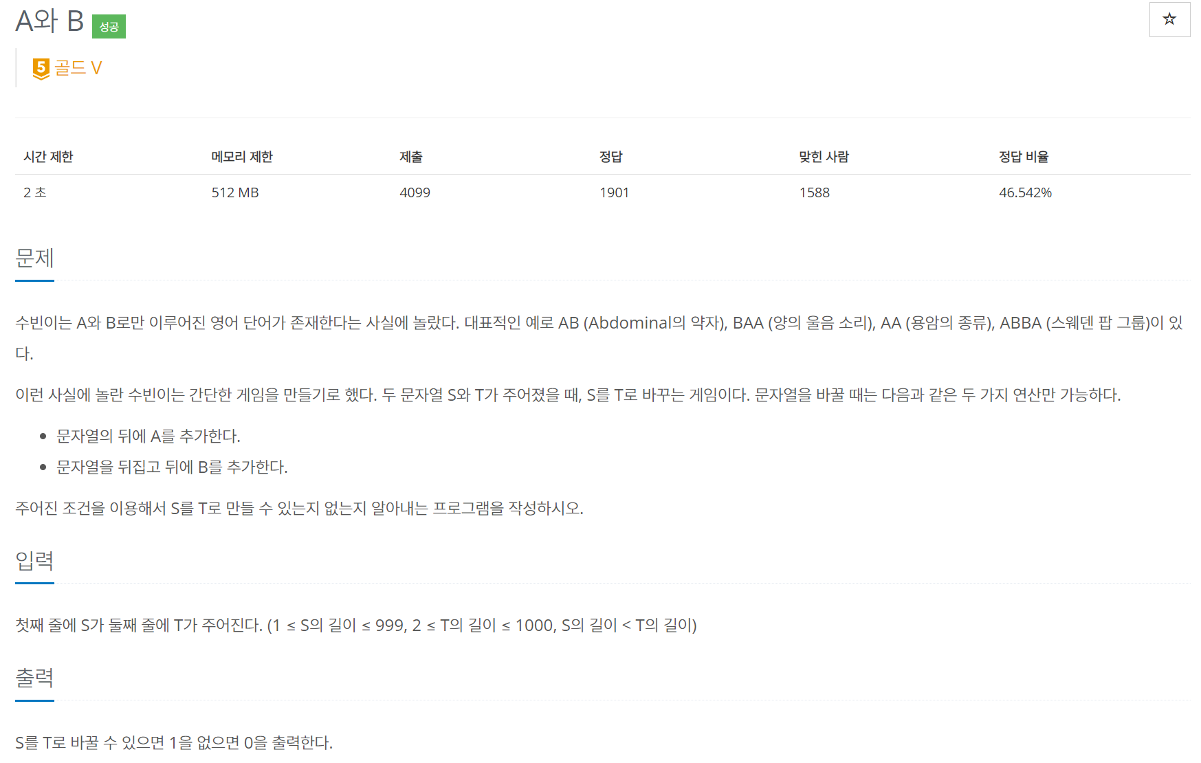 조금 간단한 구현 문제이다. 두 스트링을 받아, 첫 스트링에서 두 가지 연산을 통해 두번째 스트링이 만들어 질 수 있는지 확인하는 문제이다. 여기서, 두 연산이 모두 뒤에 각각 서로 다른 문자를 붙인다는 것에 주목하자. 만들어진(혹은 만들고 있는 과정의) 스트링의 끝을 확인하면, 이 전에 일어났던 연산이 무엇인지 바로 알 수 있다.