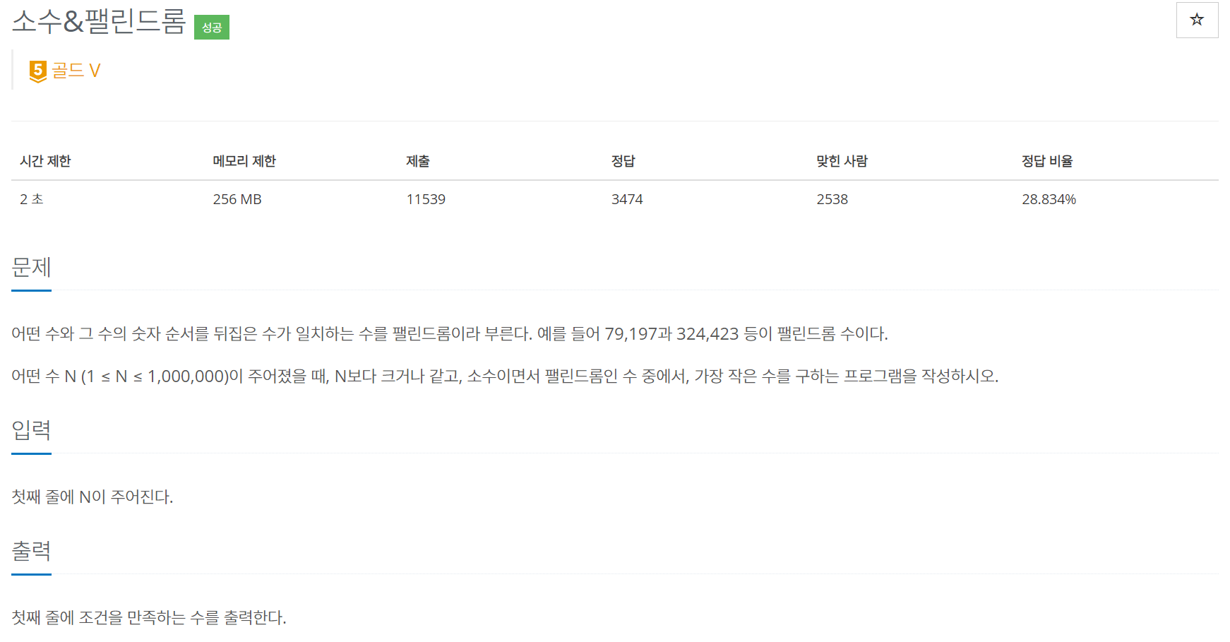간단하게 구현했다. 팰린드롬인지 확인하는 함수와, 소수인지 확인하는 함수를 짜서, 입력받은 N 이후 하나씩 늘려가며 확인했다.
