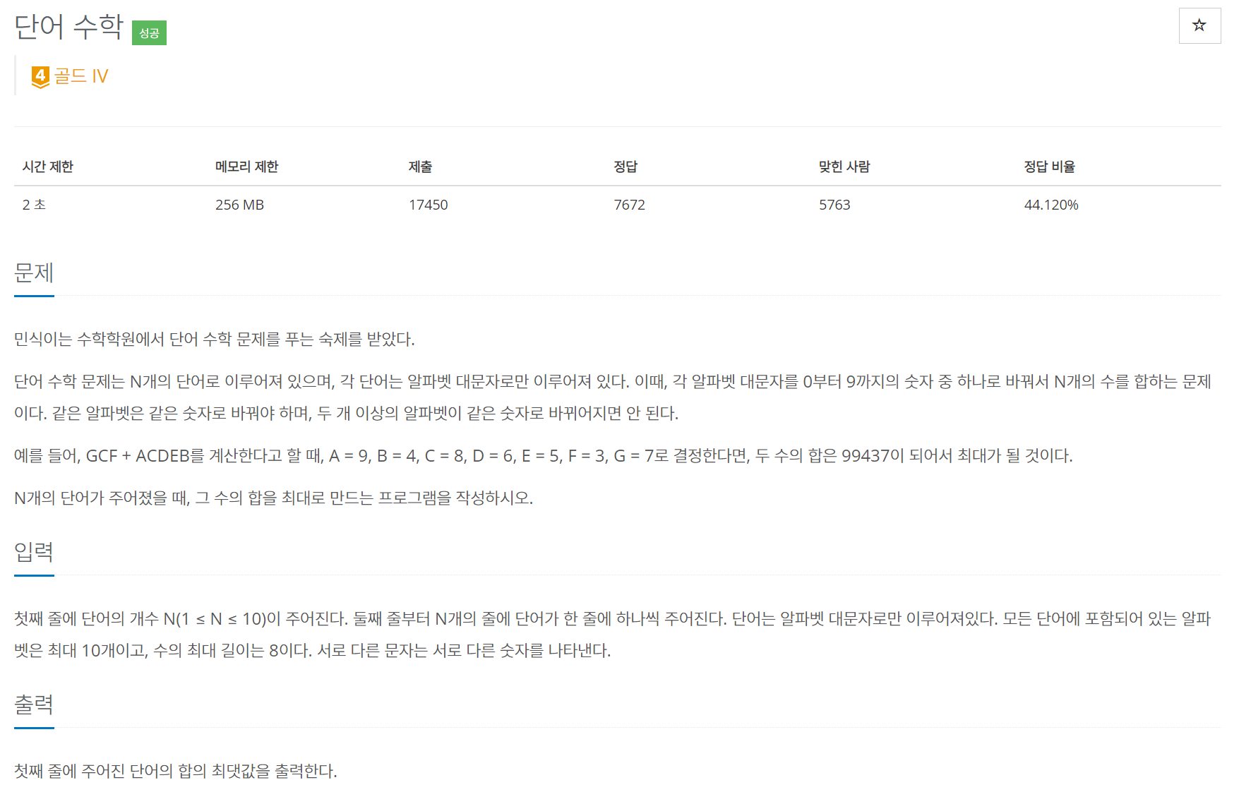 초등학교때 많이 보던 문제를 컴퓨터를 가지고 해결해보는 문제이다. 최대 10종류의 알파벳 대문자로 이루어진 단어를 숫자로 생각하고, 그 숫자들의 합이 최대가 될 때의 값을 구한다.
