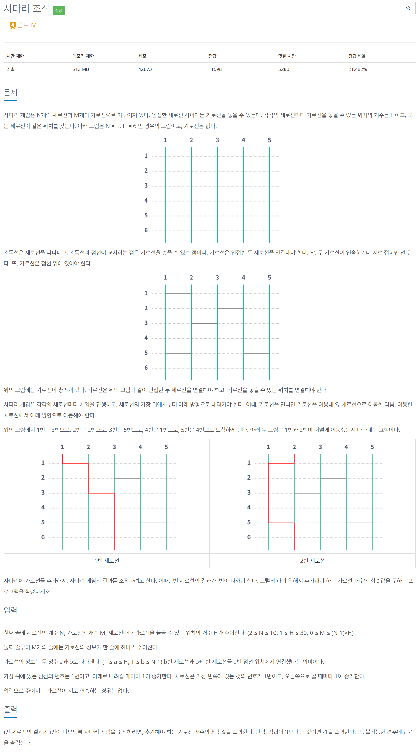 고민을 해보다가 좀 검색해봤다... 예상보다 간단했다. 가로 선을 그을 수 있는 경우의 수 공간을 탐색하는 방향으로 문제를 풀면 되었다.