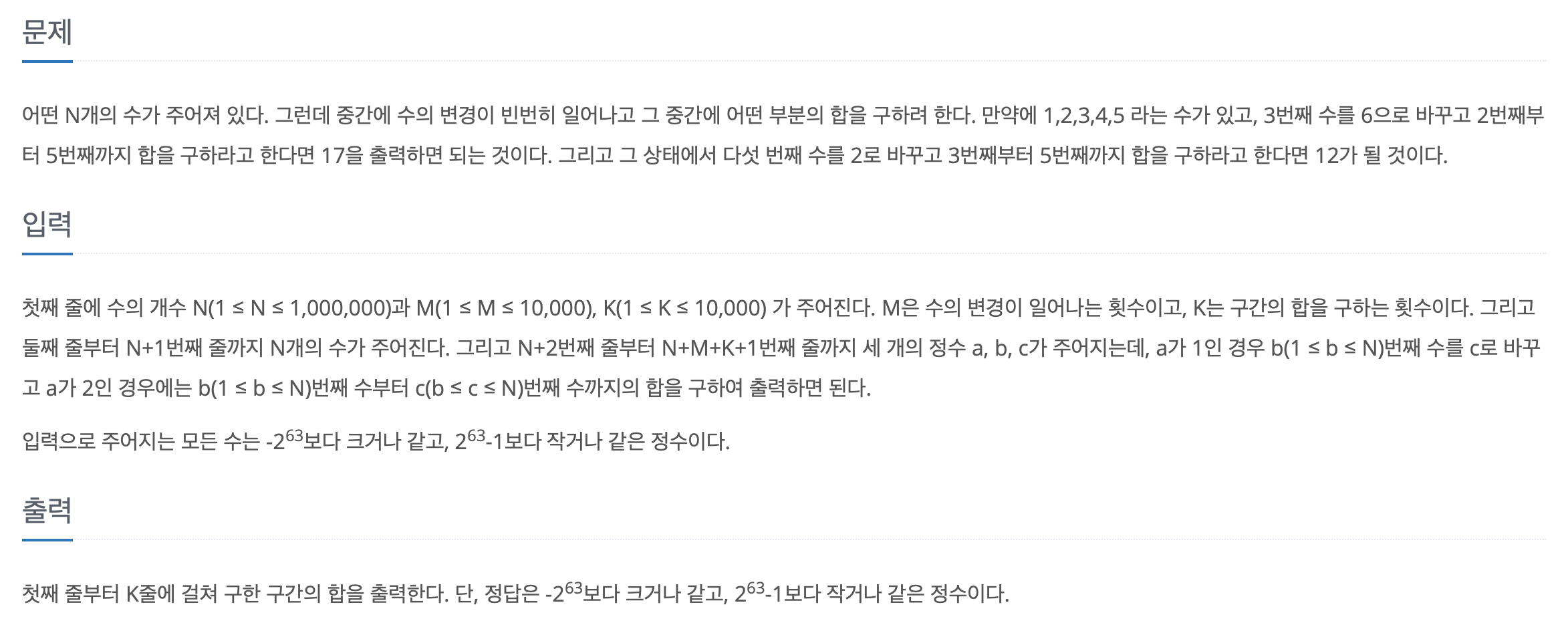 입력받은 N개의 수에서 두 인덱스 사이의 부분합을 구하거나, 특정 인덱스의 수를 변경하는 두 가지의 연산을 하면 된다.